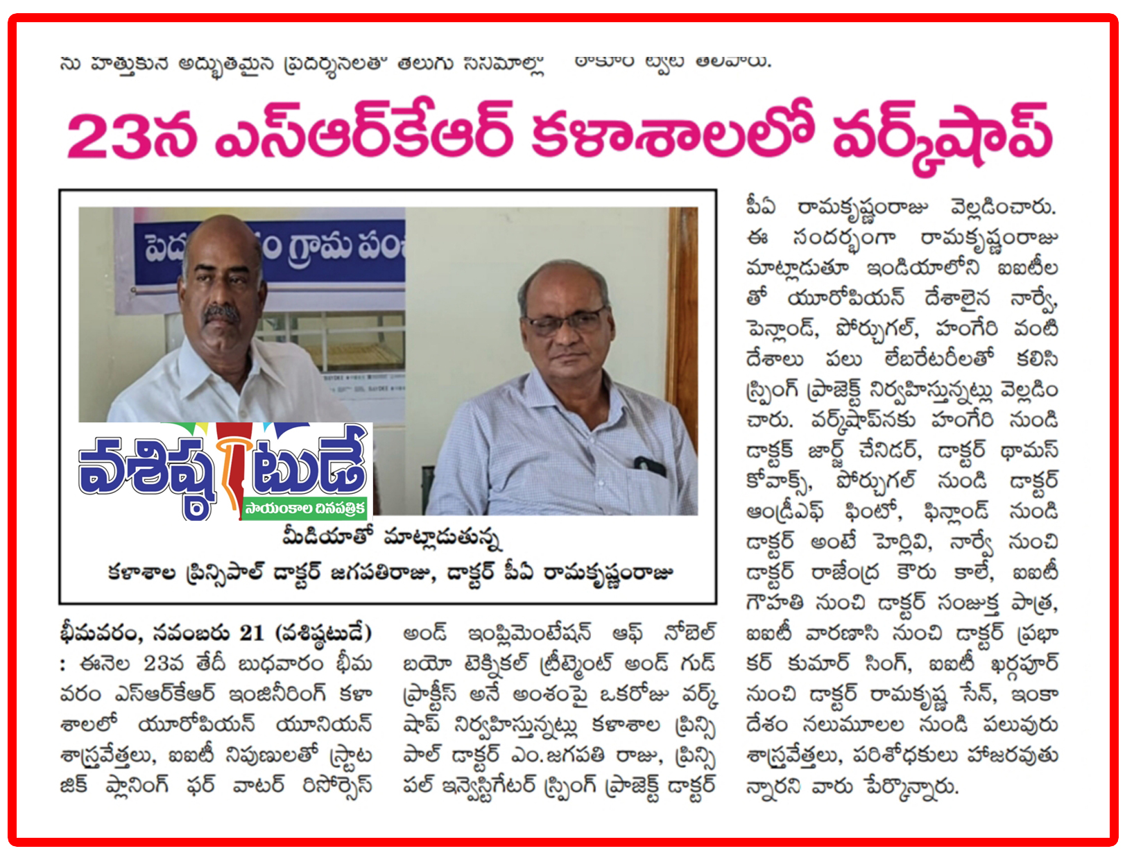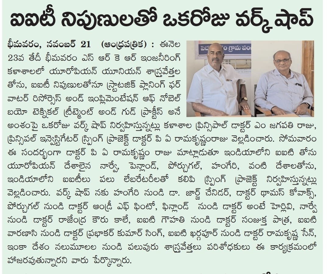 The WET Centre at SRKR Engineering College is set to host a Workshop on the above topic on 23rd Nov, 2022 with the scientists from European Union and IIT's. Speaking on this occasion Principal Dr. M. Jagapathi Raju and Principal Investigator Dr. PA Ramakrishnam Raju had said that SPRING Project was being used in SRKR in collaboration with prominent IITs in India and countries like Norway, Finland, Portugal and Hungary. They have disclosed the list of prominent scientists and professors attending the workshop.
