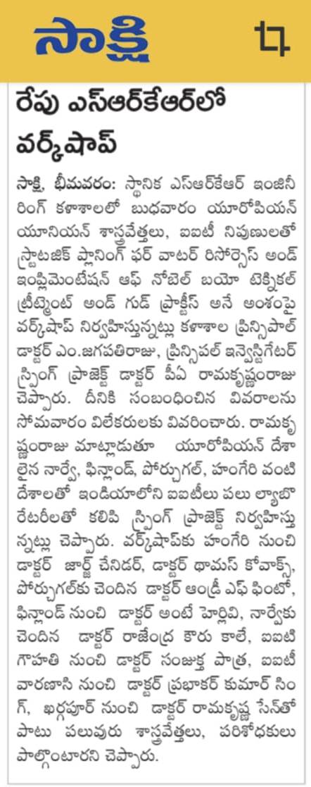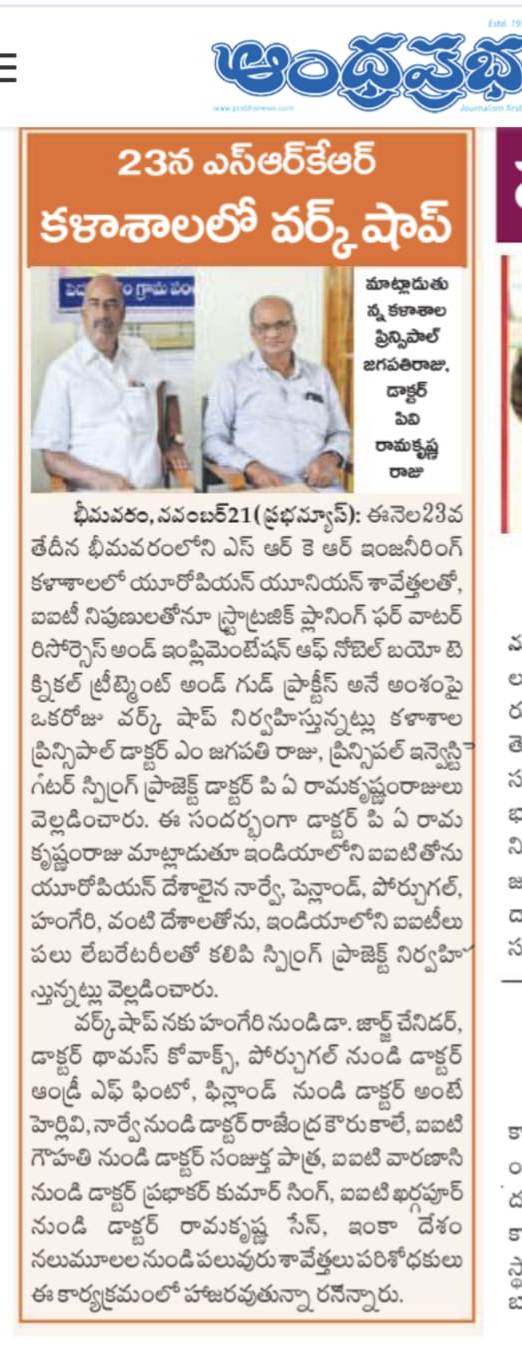 The WET Center at SRKR had organized a workshop on 'Strategic Planning for Water Resources, Implementation of Biotechnological Practices (SPRING)' with the eminent scientists from European Union and eminent IITs across the country. Speaking on this occasion, the scientists expressed that in order to provide pure water resources, village or town should be taken as a single unit. He said that it is the duty of everyone to make sure that the globe is pollution free. SPRING project is expected to be complete by coming year. The scientists were briefed about the water resources particulars by BJP Leader Mr. Paka Satyanarayana. Principal Investigator Dr. PA Ramakrishnam Raju, Principal Dr. M. Jagapathi Raju and other eminent academicians took part in this workshop.