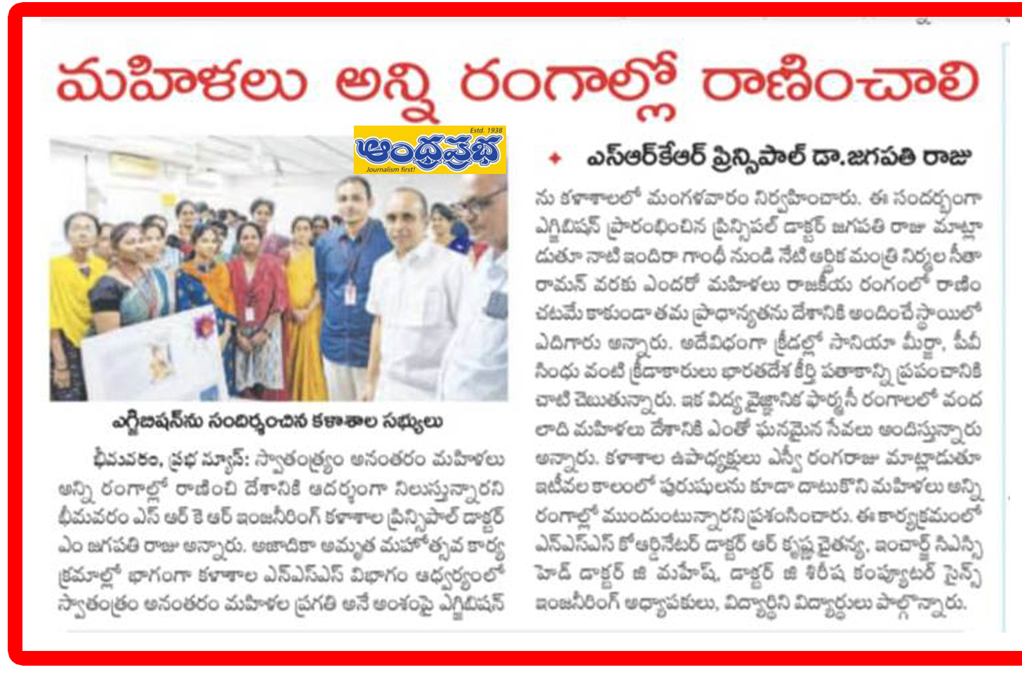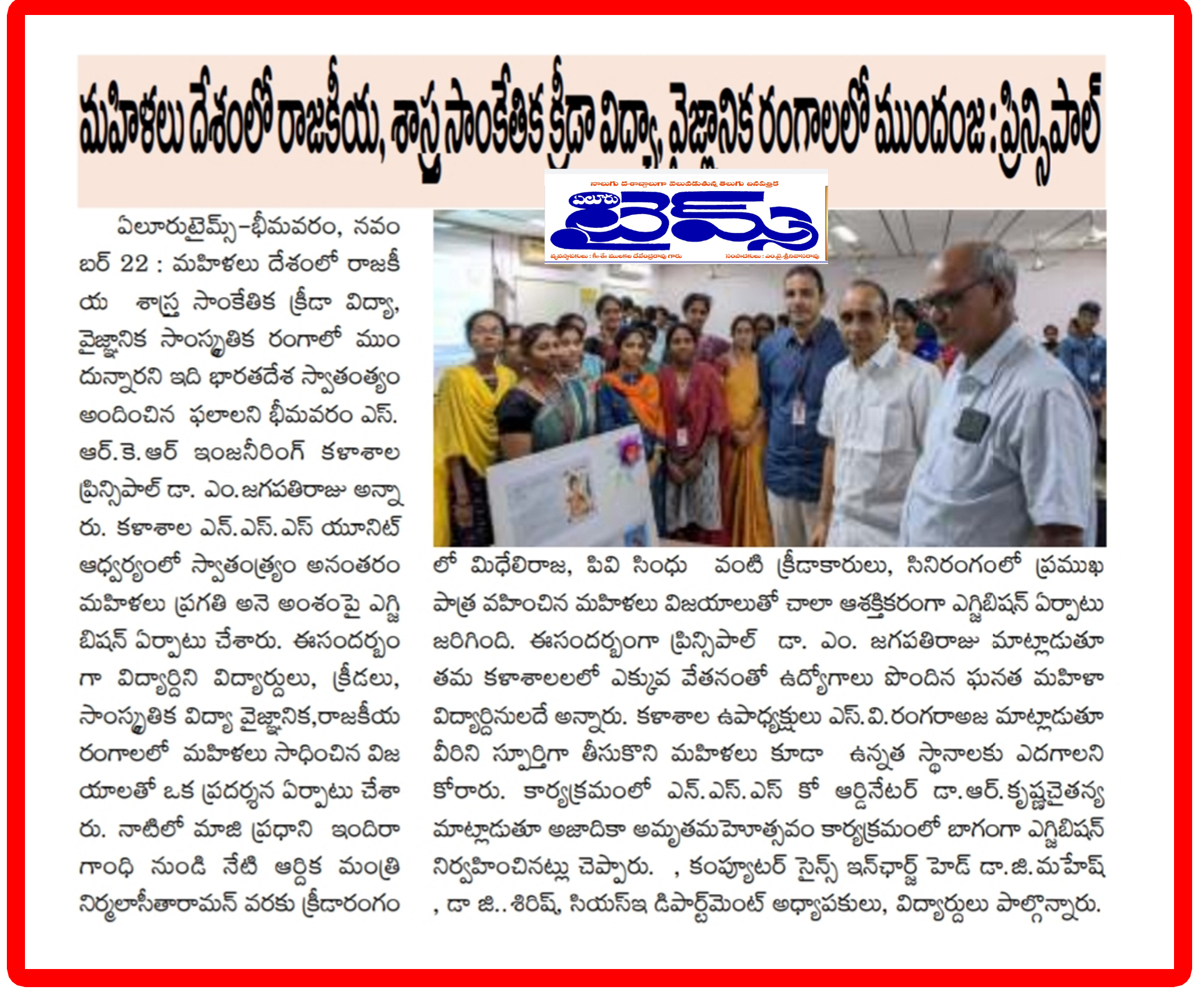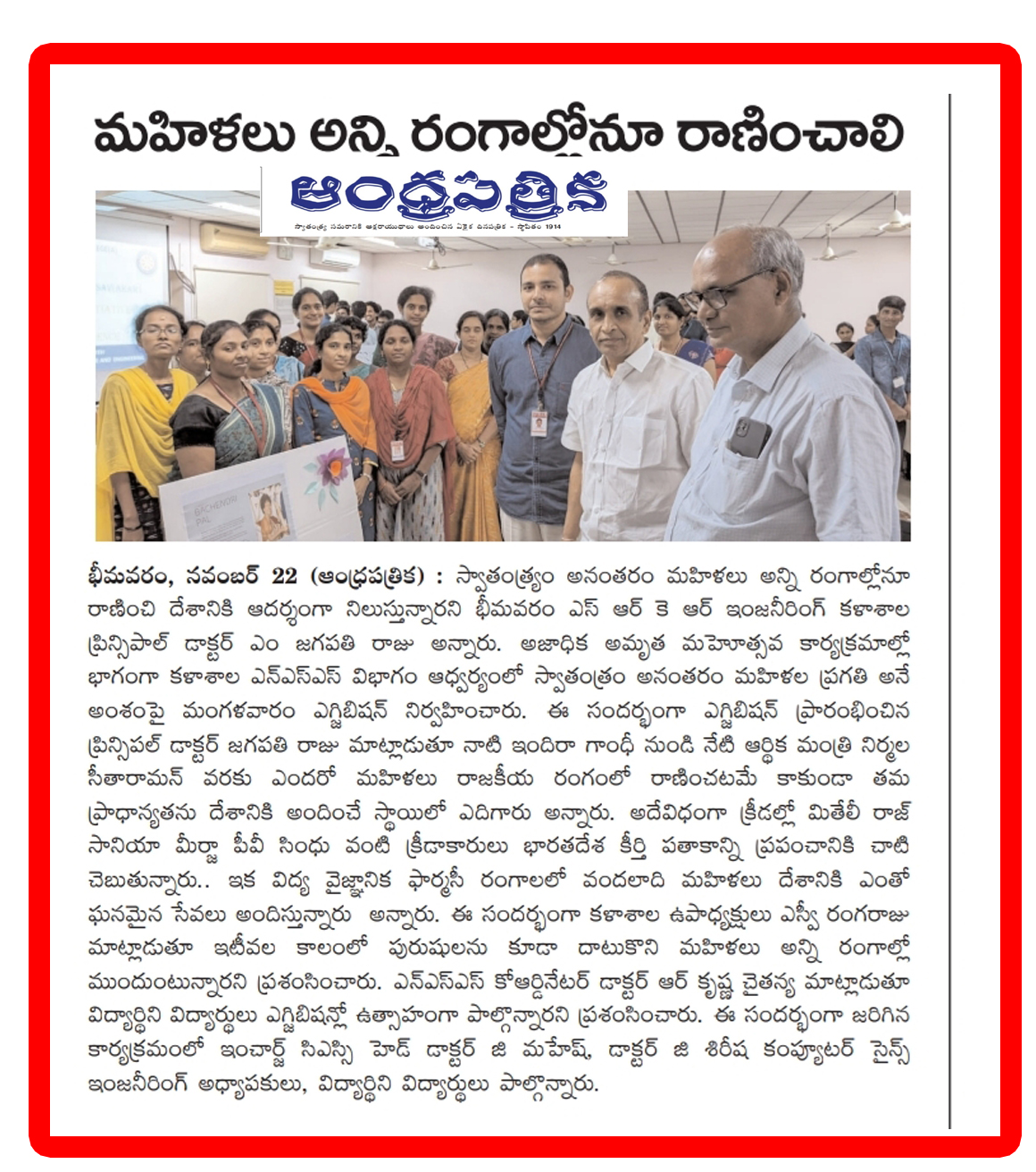 The NSS Unit at SRKR Engineering College on the occasion of Azaadi Ka Amrit Mahotsav had held an exhibition on the above topic in which students from all the branches have participated enthusiastically. Speaking on this occasion Principal of SRKR, Dr. M. Jagapathi Raju had said that Women have shown their impact in all the sectors post-independence and stood as a role model for others. He quoted the examples of former PM Indira Gandhi, present Finance Minister Smt. Nirmala Seetha Raman, Sania Mirza, Mithali Raj and many industrialists in the pharmacy sector as well. SRKR Vice President Sri. SV Ranga Raju had praised the women community for their growth in the male dominated society. In charge CSE HOD Dr. Mahesh. Dr. Sirisha, NSS Coordinator Dr. Krishna Chaitanya and other faculty members participated in this exhibition.