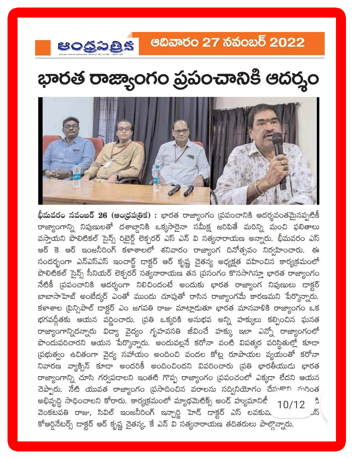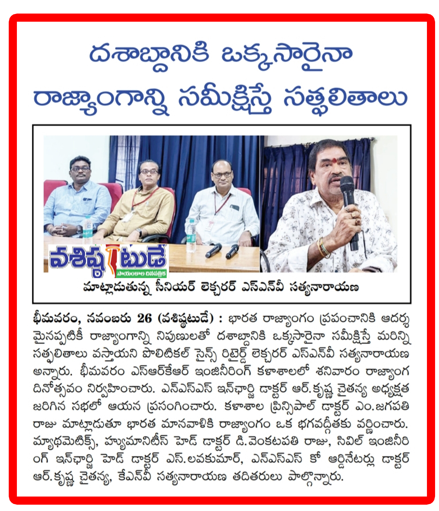 The Constitution Day Celebrations were held in a grand manner at SRKR Engineering College. Speaking on this occasion, Political Science Retired Lecturer Mr. SNV Satyanarayana had said that Indian Constitution is the role model for the whole world, however it should be revised at regular intervals in order to derive maximum benefits. Principal of SRKR, Dr. M. Jagapathi Raju had said that Indian Constitution is a holy book for the whole Indians. HOD of Mathematics&Humanities Dr. D. Venkatapathi Raju, Civil In-Charge HOD Dr. Lavkumar, NSS Coordinators Dr. Krishna Chaitanya, KNV Satyanarayana took part in this occasion.