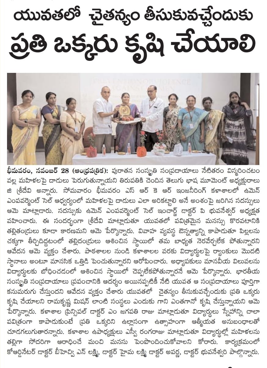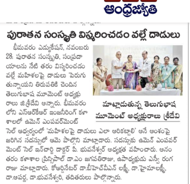 The Women Empowerment Cell at SRKR Engg College had organized a Workshop on the above topic. Speaking on this occasion Telugu Language Moment President G. Sridevi had said that the violence against women is due to non-following of our traditions and culture by the present generation people. SRKR Vice President Sri. SV Ranga Raju, Principal of SRKR Dr. M. Jagapathi Raju, Women Empowerment Cell Coordinator Dr. Bhuvaneshwari, Dr. BHVN Lakshmi, Dr. Hyma Lakshmi, Dr. Aparna took part in this event.