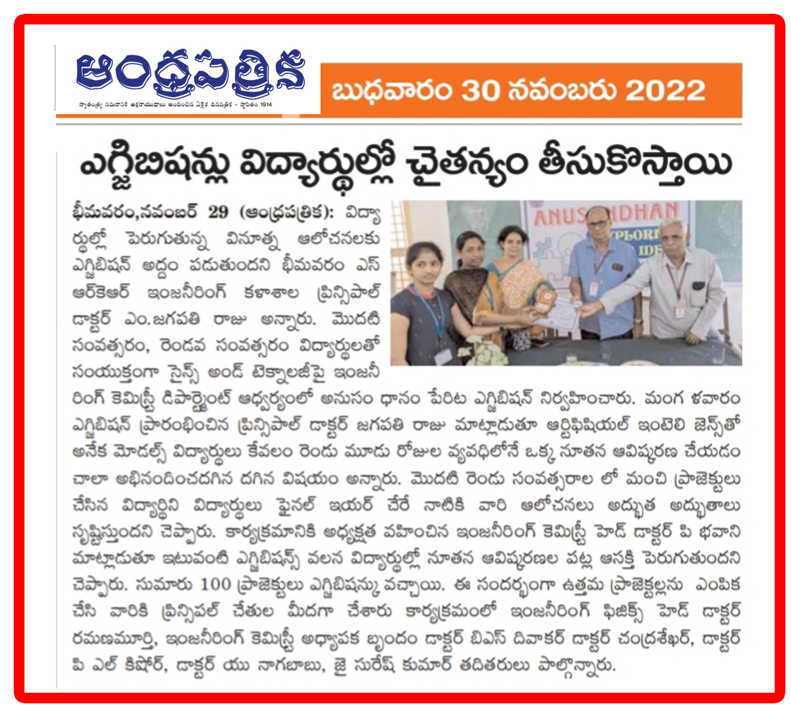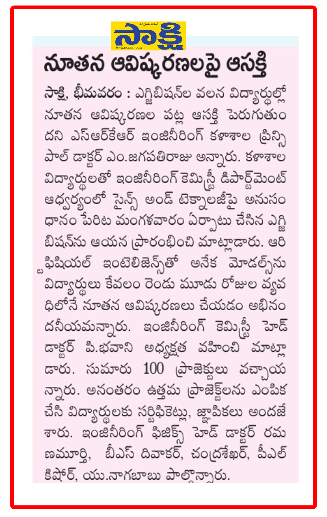 The Dept of Chemistry at SRKR Engg College had organised a student expo on integrating science and Technology named as 'ANUSANDHAN'. Speaking on this occasion Principal of SRKR, Dr. M. Jagapathi Raju had said that students can hone their creative skills by such exhibitions. He said that it is really good to know that students have displayed models on AI within 2 to 3 days by developing on their own. HOD of Chemistry Dr. P. Bhavani had said that students have displayed over 100 models. Best models were recognised and honoured with certificates. HOD of Physics, Dr. Ramana Murthy, Dr. Diwakar, Mr. Chandrasekhar, Mr. Kishore, Mr. Nagababu took part in this event.