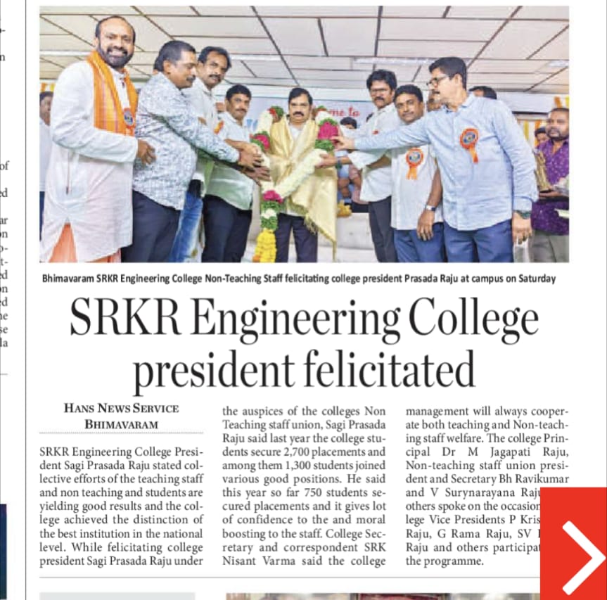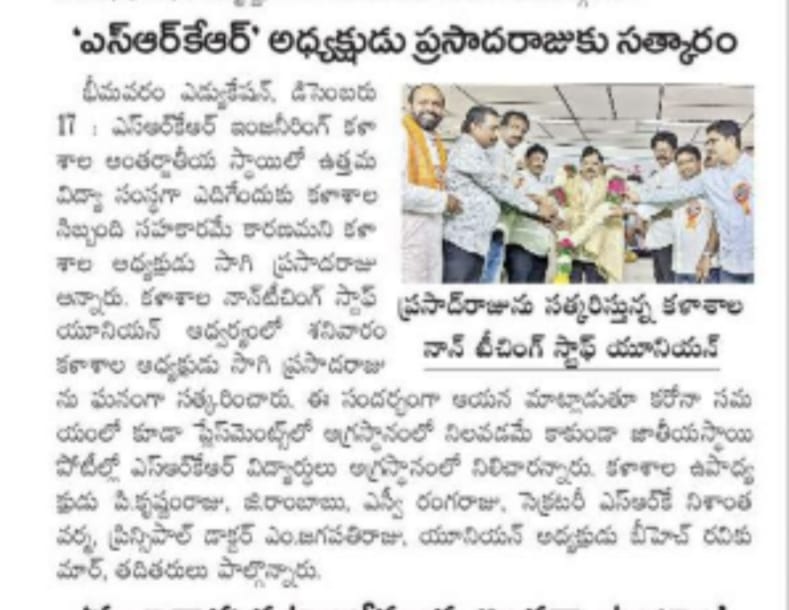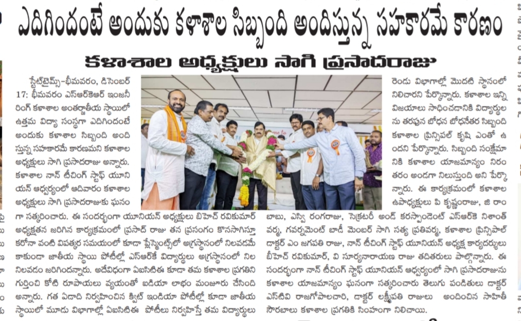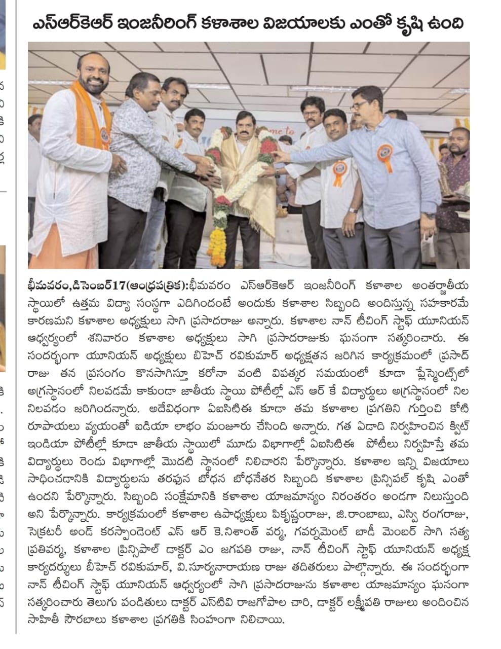The Non-Teaching Staff Union at SRKR had felicitated the President of SRKR Sri. S. Prasada Raju in the campus. Speaking on this occasion, he said that SRKR gained fame in the International arena due to the support and cooperation of the teaching and non-teaching staff. He said that even in times of pandemic, students of SRKR succeeded in getting good placements and had won many accolades in the national level. Governing Body Members, Secretary and Correspondent Sri. SRK Nishanth Varma, Principal Dr. M. Jagapathi Raju and the Non-Teaching Staff union representatives took part in this occasion.