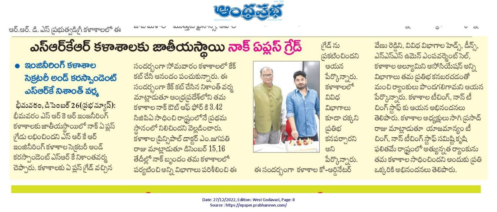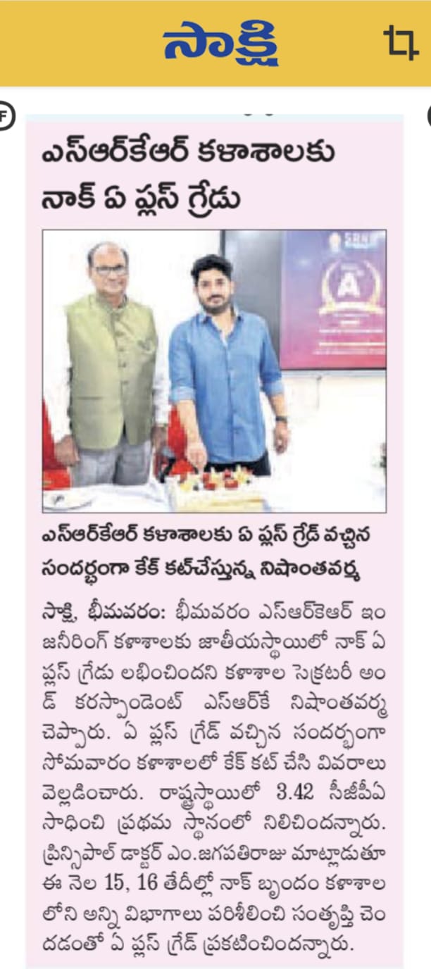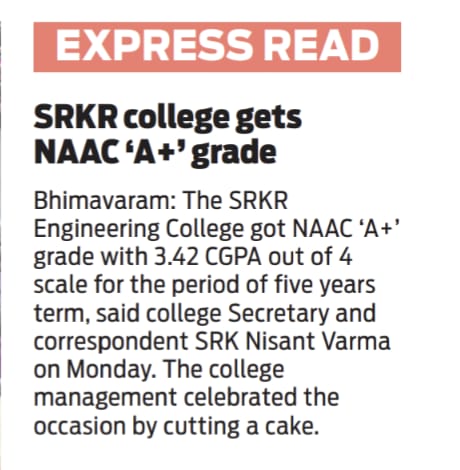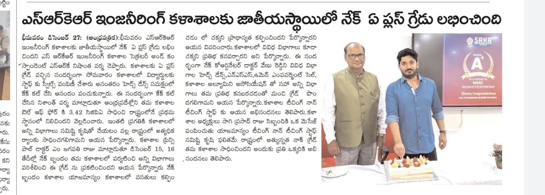 SRKR Engineering College is accredited by NAAC with A+ Grade, Secretary and Correspondent of SRKR Sri. SRK Nishanth Varma had told the reporters at a meeting organised in the college on 26th Dec, 2022. The management celebrated this commendable achievement by cutting the cake and thanking all the stakeholders. SRKR had been awarded 3.42 CGPA and stood among the top colleges in the state of Andhra Pradesh. Principal of SRKR, Dr. M. Jagapathi Raju had said that NAAC Committee members had visited the college on Dec 15th and 16th and examined the facilities and infrastructure of the college. HOD’s and Deans took part in this success celebrations.