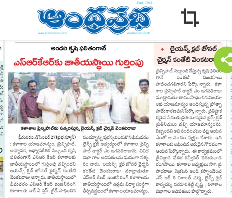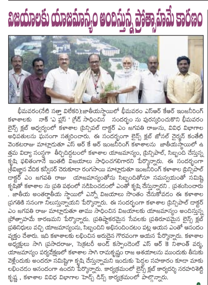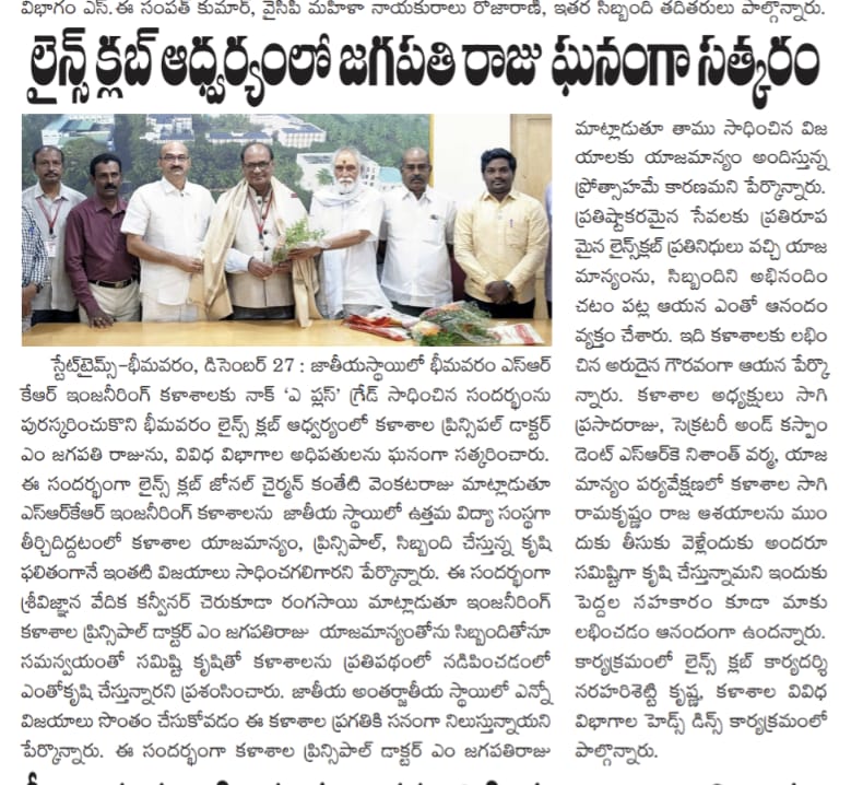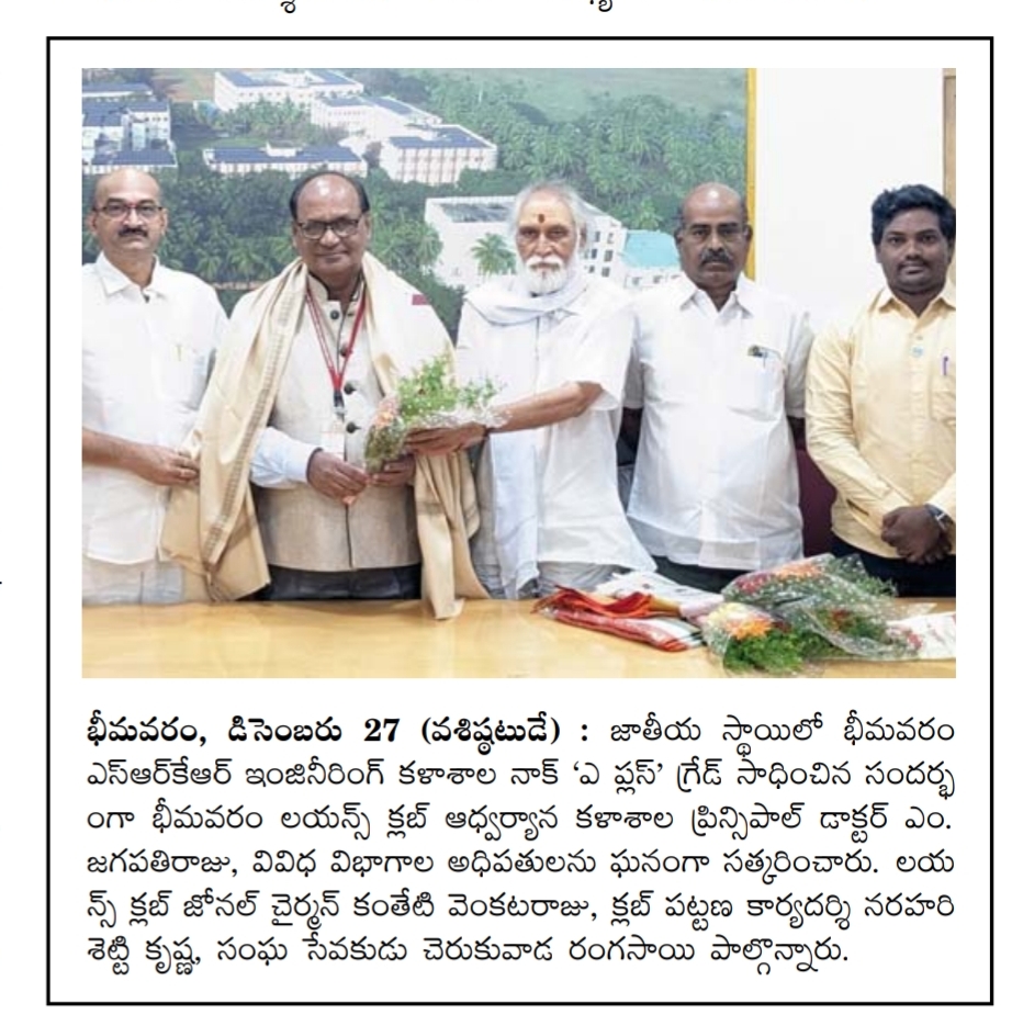 The Lions Club of Bhimavaram had felicitated the Principal, HOD’s and Deans on 27th December 2022 for getting NAAC A+ accreditation. Speaking on this occasion President of Lions Club, Mr. K. Venkataraju had said that the entire Bhimavaram city and District of West Godavari is proud of SRKR and its achievements. Social Service activist, Mr. Rangasai had said that this achievement is only possible with the collective effort of all the departments and staff of the organisation. Principal of SRKR, Dr. M. Jagapathi Raju had said that the cooperation of the management is very vital in getting this accreditation and SRKR is marching ahead in the direction set by founder Dr. Sagi Ramakrishnam Raju, President Mr. S. Prasada Raju, Secretary&Correspondent Mr. SRK Nishanth Varma and other management members. Representatives of the Lions Club, HOD’s and Deans took part in this occasion.