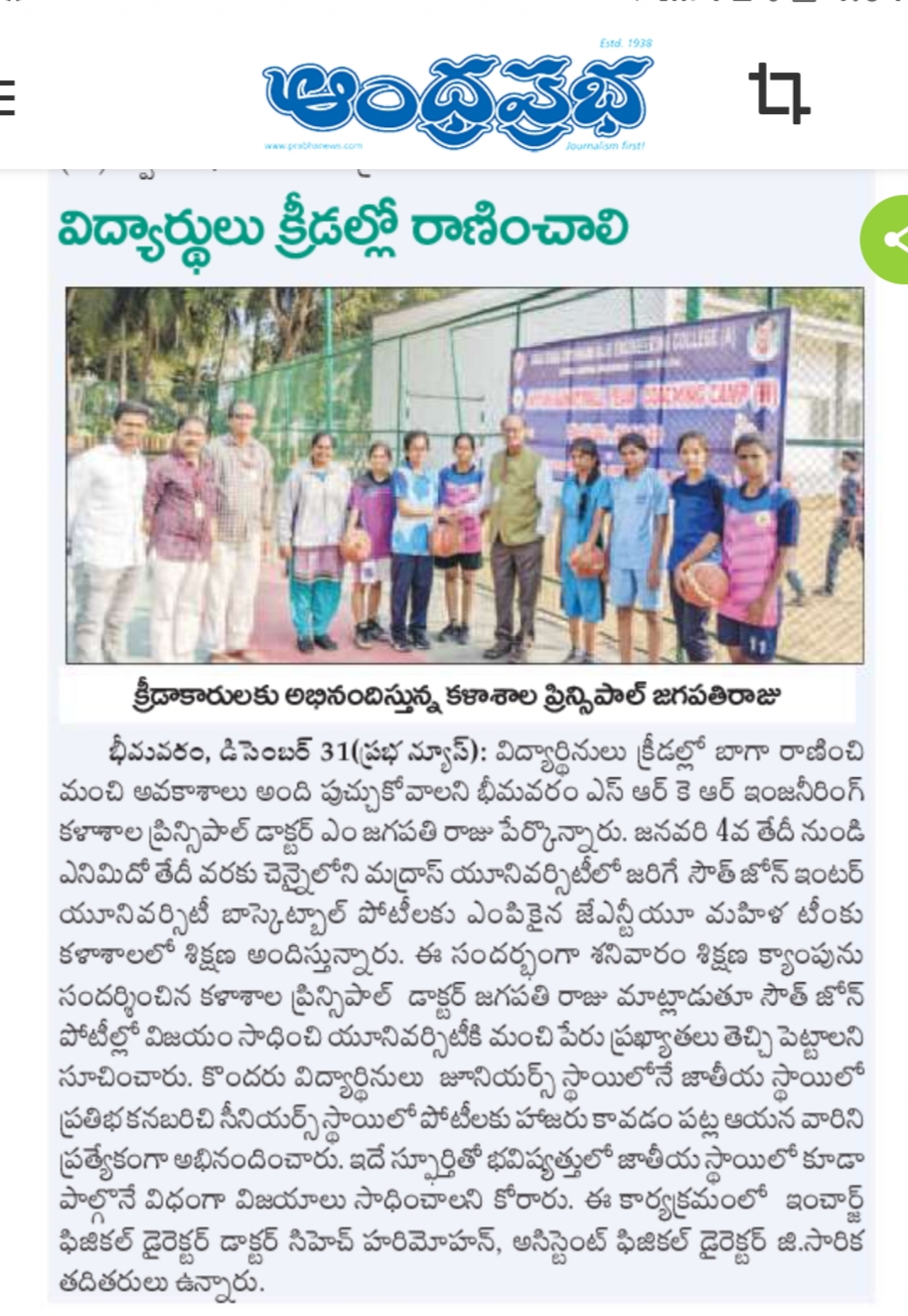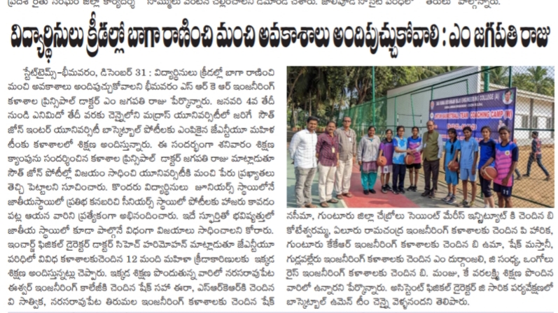 The coaching camp for University Women Basketball team is being conducted at SRKR. This team is going to represent JNTUK at South zone inter university Basketball Tournament from Jan 4 th to 8 th at Madras University, Chennai. Principal of SRKR, Dr. M. Jagapathi Raju had visited the camp and wished the students all the best. He said that students should progress in sports as well as academics. In charge PD Dr. Harimohan had said that 12 students from institutions under the purview of JNTUK are being trained here at SRKR. The team is going to Chennai in the supervision of Assistant PD Ms. G. Sarika of SRKR.