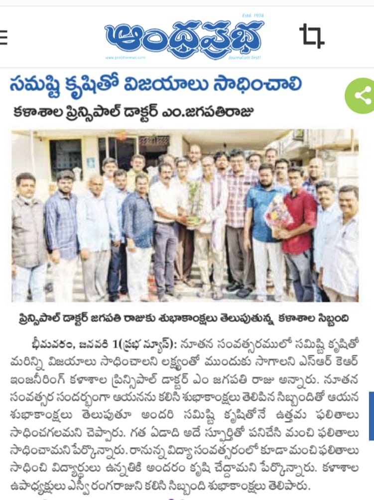 occasion of New Year. Various staff members had met him and wished him on this occasion. He said that Collaborative effort only brings good results and so everyone should work with unity in the path of progress. There were some extremely important achievements that the college had got last year and this year too they must be replicated with more efforts. He said that the management is ready to go to extra mile for the benefit of the institution, staff and students. The staff had met and wished the Vice President of SRKR Sri. SV Ranga Raju garu too.