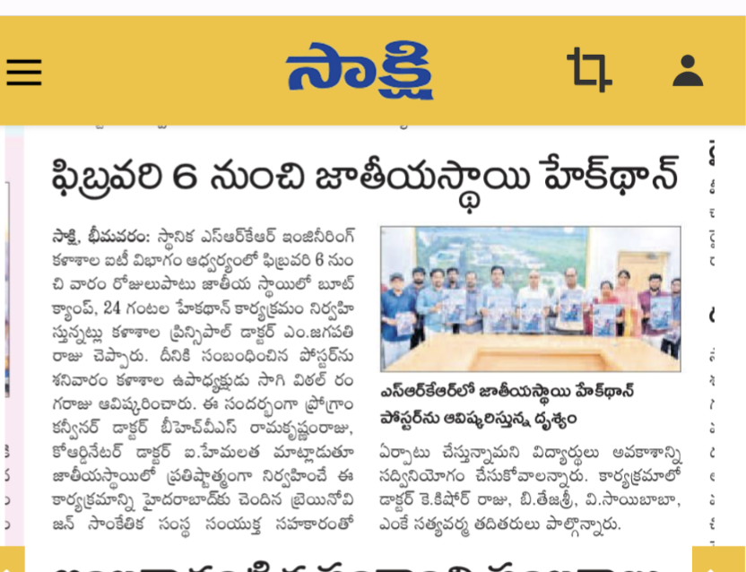 IT Dept of SRKR Engg College is conducting National Level Boot Camp and 24 Hours Hackathon starting from Feb 6 th , Principal of SRKR Dr. M. Jagapathi Raju had said. The poster relating to the same was released in the campus by Vice President Sri. SV Ranga Raju. Programme Coordinator and HOD of IT Dept Dr. BHVS Ramakrishnam Raju had said that this programme is organized in technical collaboration with Brain O Vision of Hyderabad. Dr. Hemalatha, Dr. Kishore Raju, B.Teja Sri, Saibaba, Satya Varma took part in this event.