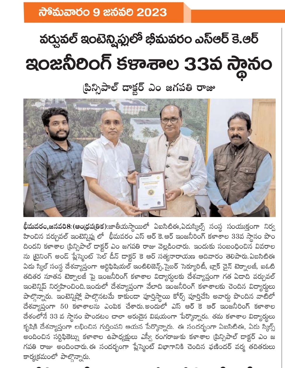 SRKR gets 33 rd Rank at National Level in AICTE EDUSKILLS Virtual Internship program. The details regarding the same were disclosed by Principal Dr. M. Jagapathi Raju, Vice President Sri. SV Ranga Raju and Dean Placements Dr. Satyanarayana. AICTE EDUSKILLS had created virtual internship opportunities to the students on latest technologies at PAN India Level. Under this programme students completed their internships and top 50 colleges were recognized at the national level. It is a matter of great pride that SRKR stood at 33 rd Rank in the national level. The certificate relating to the same was handed over to Vice President Sri. SV Ranga Raju by Principal Dr. M. Jagapathi Raju.