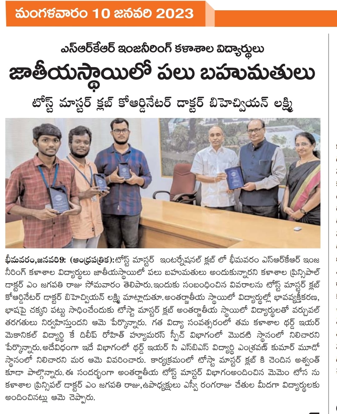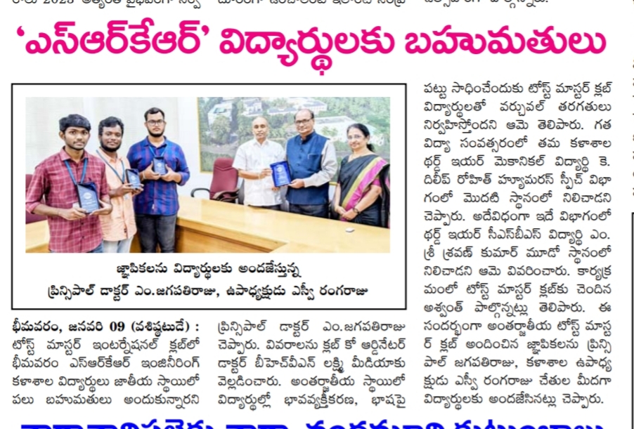 The students of SRKR had brought accolades by participating in various competitions in Toastmasters Club at the National Level and improved their proficiency and expression of thoughts, Principal of SRKR Dr. M. Jagapathi Raju had said. Third Year Mechanical student Mr. Dilip Rohit had got first prize in Humorous Speech and Third Year CSBS student Mr. Sravan Kumar had got third prize. The mementoes given by International Toastmasters Club for these students were being handed over to them by Vice President of SRKR Sri. SV Ranga Raju, Principal Dr. M. Jagapathi Raju and Coordinator of Toastmasters Club Dr. Lakshmi.