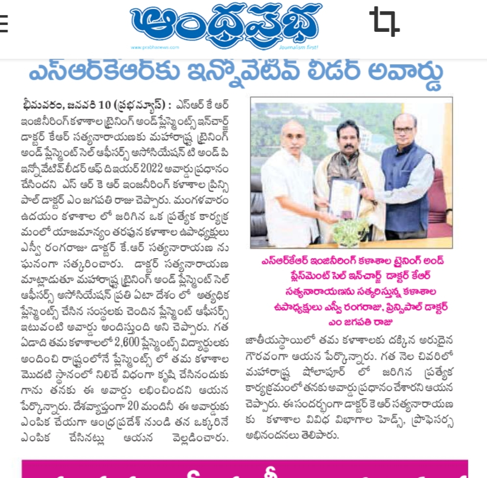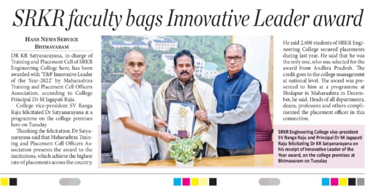 The Maharashtra Training and Placement Cell Officers Association had awarded Innovative Leader award to SRKR Placement Officer Dr. Satyanarayana, Principal of SRKR Dr. M. Jagapathi Raju had said. He was felicitated in the campus by Principal and Vice President of SRKR Sri. SV Ranga Raju. Speaking on this occasion Dr. Satyanarayana had said that the top 20 placement officers across the country are awarded and SRKR was the only one to receive from the state of Andhra Pradesh. He thanked the efforts of the college management which had played a key role in securing the highest number of placements for the students of SRKR. Dr. Satyanarayana was congratulated by HODs, Deans and Faculty of the institution.