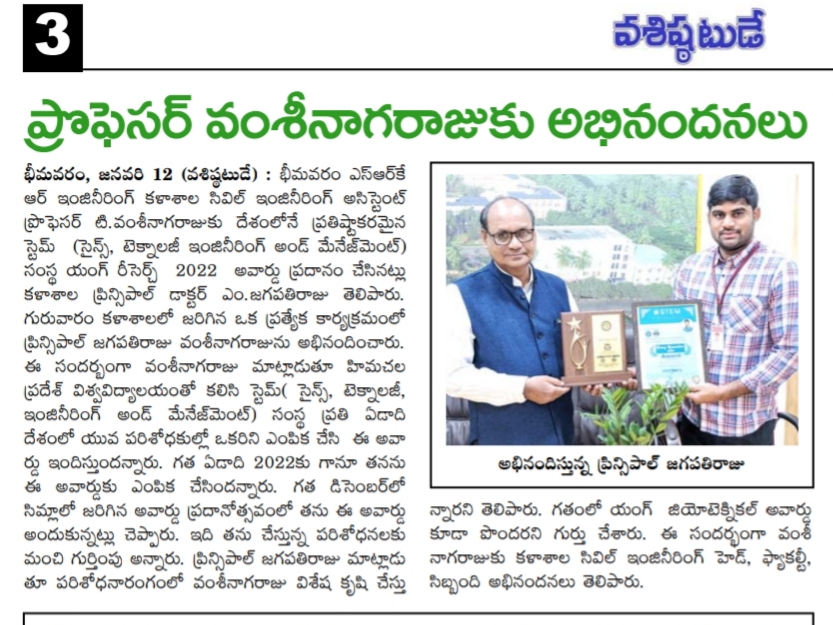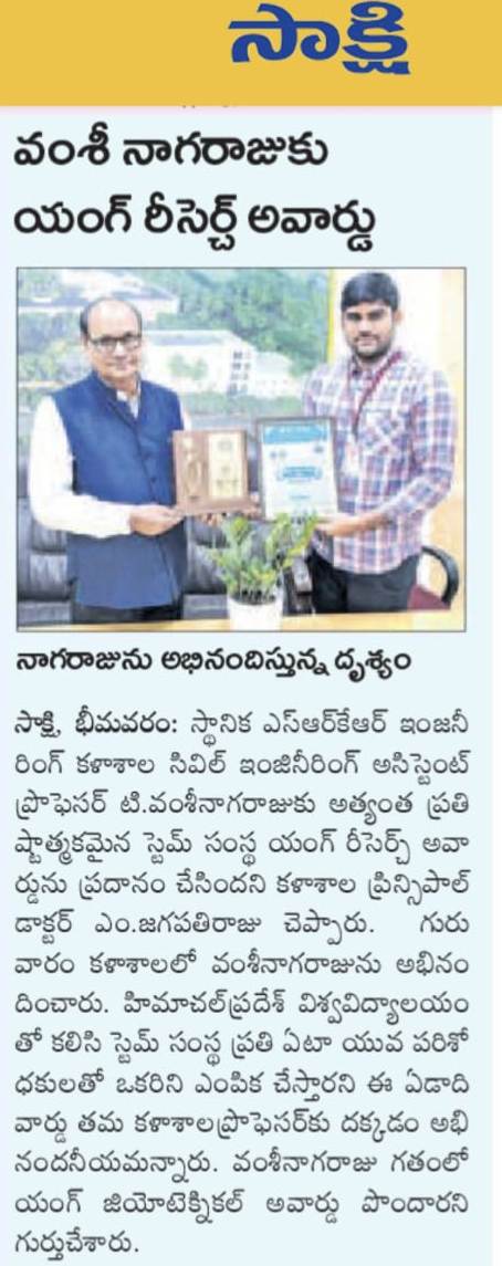Civil Engineering Assistant Professor Mr. Vamsi Nagaraju had received Young Researcher Award from the STEM Institute, Principal of SRKR Dr. M. Jagapathi Raju had said. He congratulated Mr. Nagaraju for this achievement and wished him all the best for the future. He said that every year Himachal Pradesh University in association with STEM will select one as the young researcher across the country. Earlier Mr. Nagaraju had received Geo technical award too.
