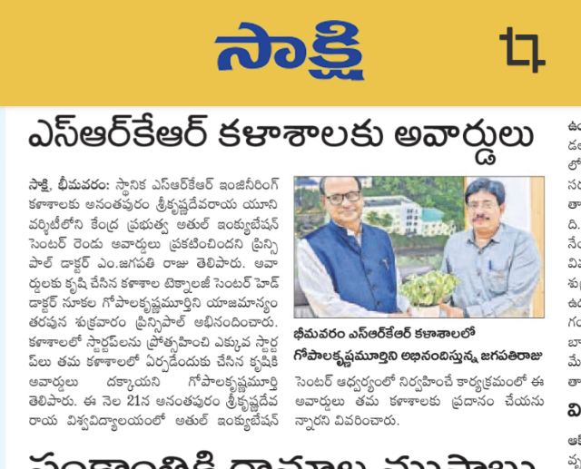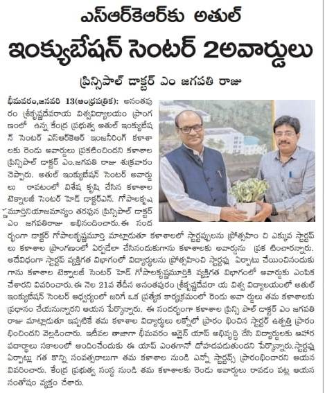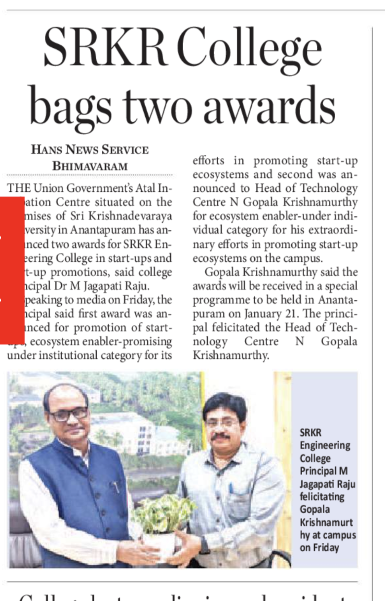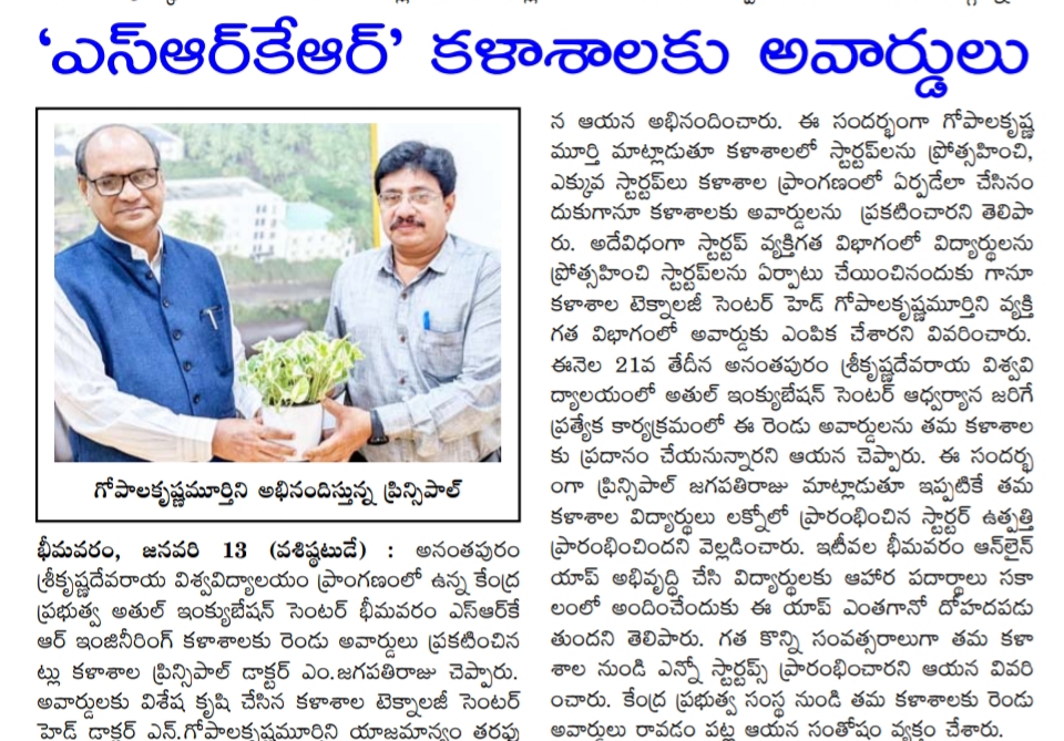Atal Incubation Centre at Sri Krishnadevaraya University, Anantpur is going to present awards to SRKR Engineering College for its efforts in promoting the start-up ecosystem, Principal of SRKR Dr. M. Jagapathi Raju had said. Technology Centre head Dr. Gopalakrishna Murthy is being felicitated by the Principal on this occasion. Dr. Murthy had said that these awards are being presented for encouraging the start-up ecosystem and starting more start-ups in the campus. These awards are going to be presented at the university on 21 st January, 2023.