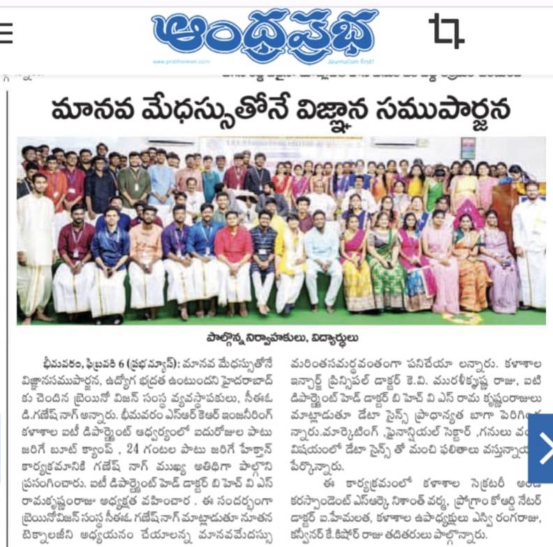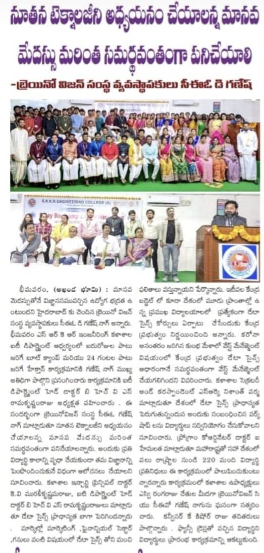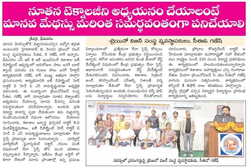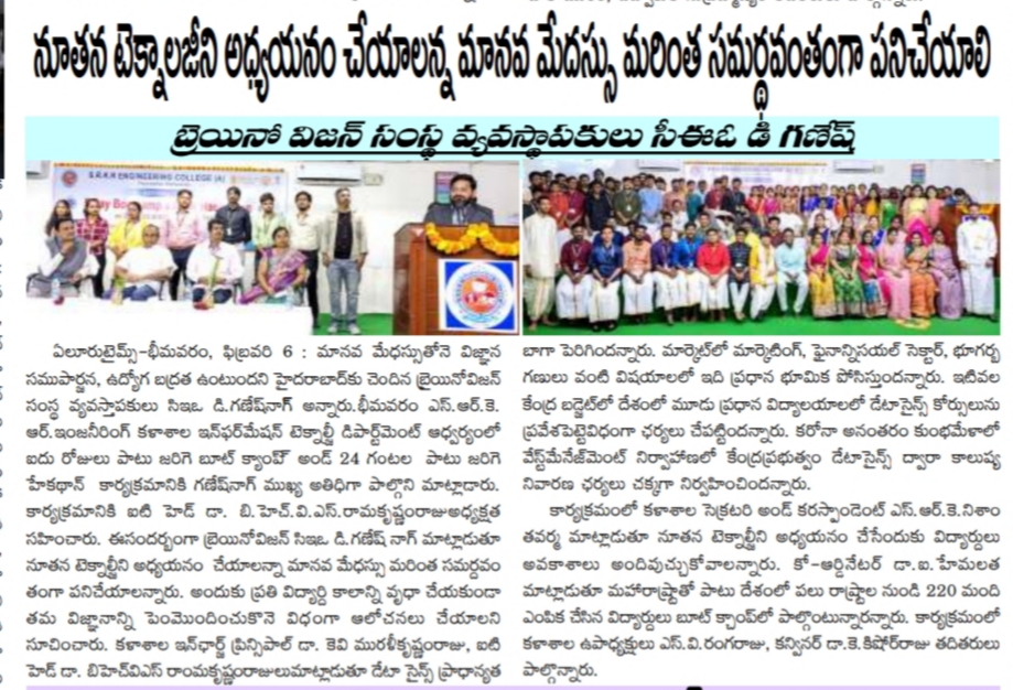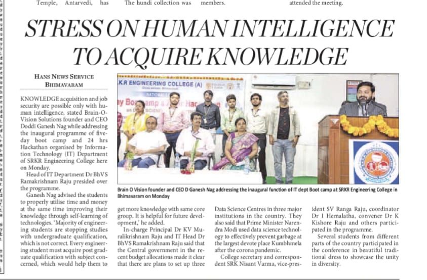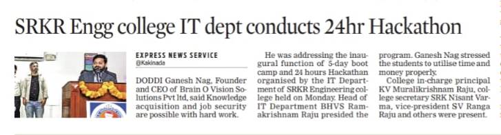 The Dept of IT is conducting Bootcamp and 24 Hours Hackathon and the same was inaugurated on 5 th Feb by CEO of Brain O Vision Mr. D. Ganesh Nag. Speaking on this occasion he said that through human brain and intellectual skills alone we can acquire knowledge. IT Dept HOD Dr. BHVS Ramakrishnam Raju and Incharge Principal Dr. Muralikrishnam Raju had said that Data Science relevance was there in all the fields and so students should focus more on it. Vice President of SRKR Sri. SV Ranga Raju, Programme Coordinators Dr. Hemalatha, Dr. Kishore took part in this occasion.