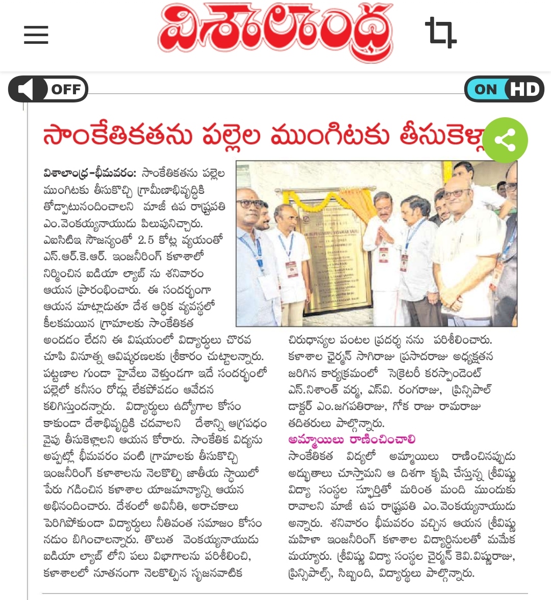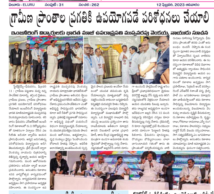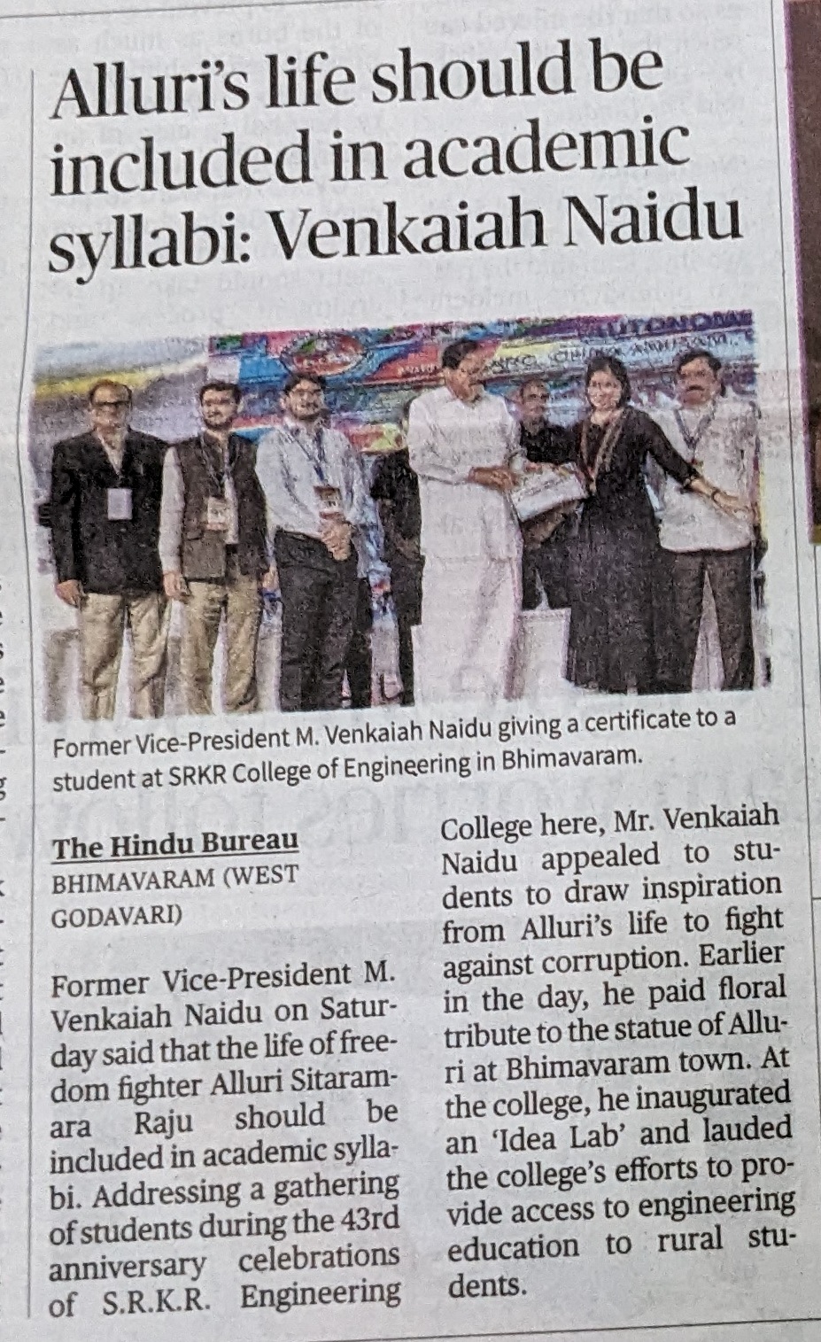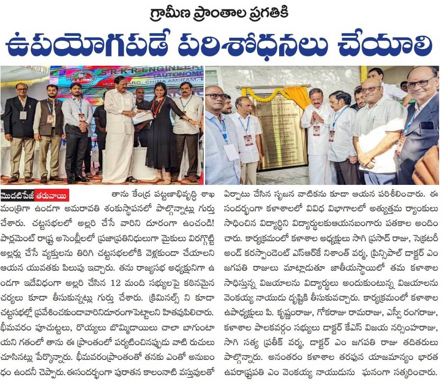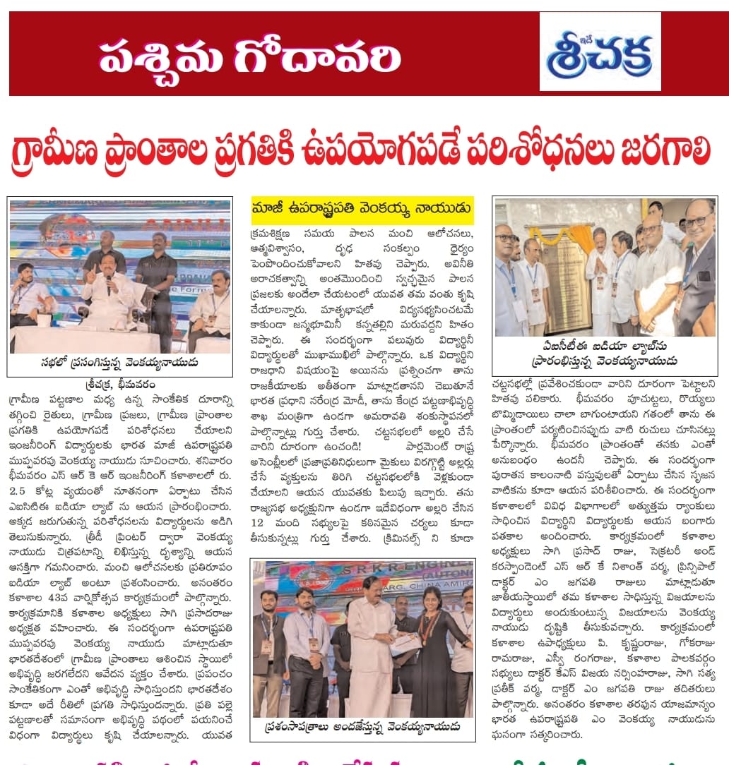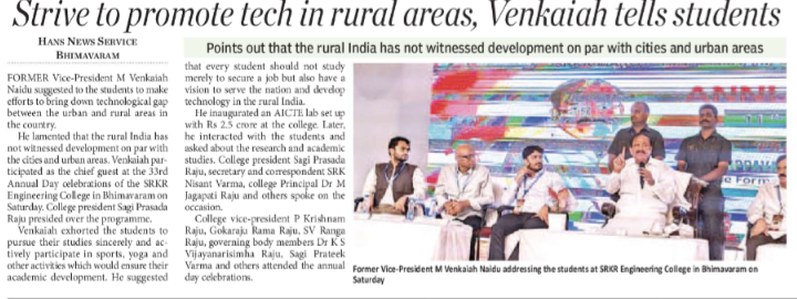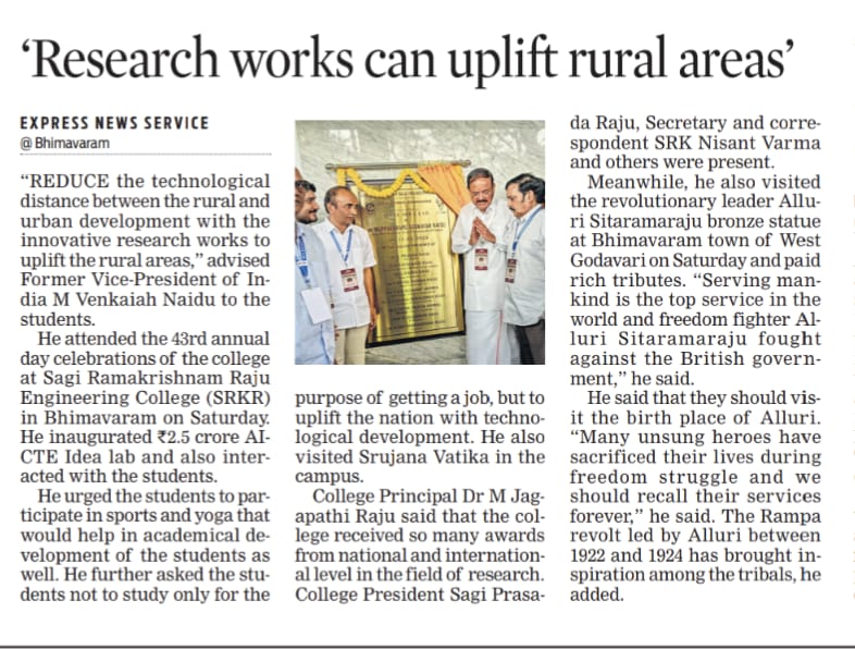 AICTE IDEA LAB and 43 rd Annual Day Celebrations of SRKR Engg College were inaugurated by Former Vice President of India Sri. M. Venkiah Naidu Garu. Speaking on this occasion he said that research towards promoting new infrastructure in rural areas should be promoted. He visited and appreciated SRUJANA VATIKA a centre of our heritage and traditions. President of SRKR Sri. SD. Prasad Raju and Secretary and Correspondent Sri. SRK Nishanth Varma stressed the need of traditions and culture in student’s life and urged the students to make use of the IDEA LAB. Principal of SRKR Dr. M. Jagapathi Raju had presented a brief report of various accomplishments of SRKR Engg College in the academic year. Sri. Venkiah Naidu Garu was felicitated grandly by the management and governing body members of the college. Members of the Management, Governing Body, Parents, Faculty and students were present at this event.