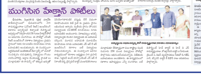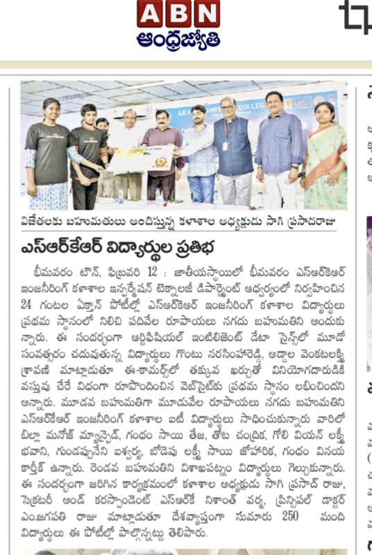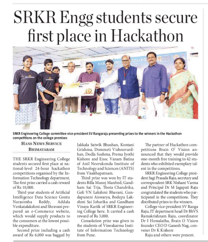 The valedictory function of 24 hours Hackathon and 5 Day Bootcamp by the Dept of IT was held on 12 th Feb, 2023. President of SRKR Sri. S. Prasad Raju, Secretary & Correspondent Sri. SRK Nishanth Varma, Vice President of SRKR Sri. SV Ranga Raju, Principal Dr. M. Jagapathi Raju, CEO of Brain O Vision Sri. Naga Ganesh, HOD of IT Dr. BHVSRK Raju took part in this occasion and distributed the prizes to the winners. 1 st Prize in Hackathon was won by the SRKR Team for developing a new E- Commerce system with nominal cost and effective performance. Students from various colleges across the country took part in this event. Event Coordinators Dr. Hemalatha and Dr. Kishore Raju took part in this event.