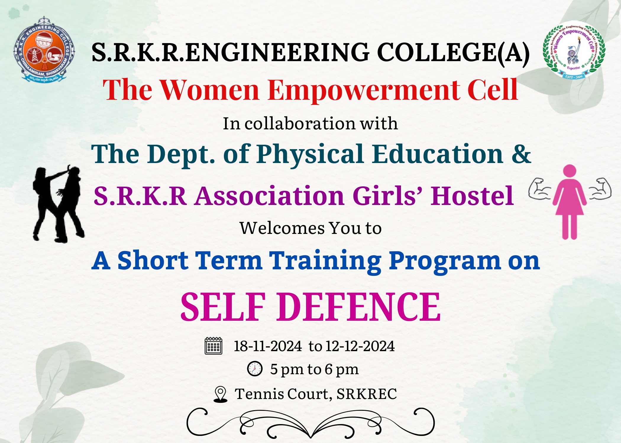 The Women Empowerment Cell of SRKREC is committed towards the promotion and practice of the ideals of gender equity, human dignity and the rights of all human beings. The role and responsibility of WEC is to enhance the awareness of gender sensitization and to create an atmosphere free from any form of ragging, sexual discrimination and sexual harassment, prevention, prohibition and social security, counselling etc. WEC organizes various activities to create awareness on safety and security, self-defence, gender sensitivity and health to ensure a healthy and secure environment to the girl students and the women faculty. Counselling is provided to encourage the students for early reporting of any issues/ complaint/ grievance of anything that comes into the purview of the college.